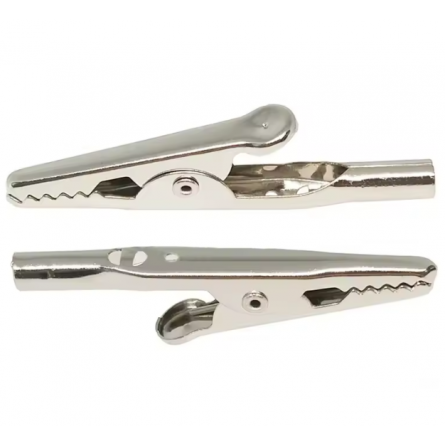 Pince "crocodile" avec trou pour fiche banane de 4mm et vis de fixation directe pour fil de câblage. La paire