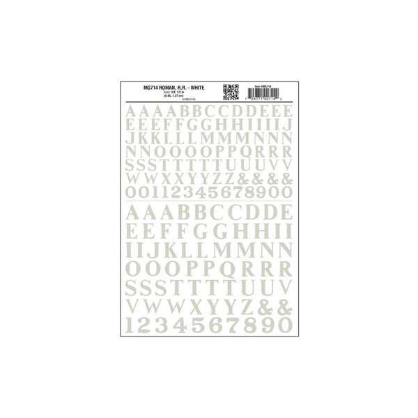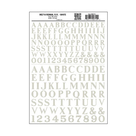 Alphabet et chiffres à transfert à sec - Caractères romains ferroviaires (3/8 et 1/2") - Blanc