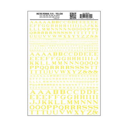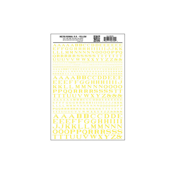 Alphabet à transfert à sec - Caractères romains ferroviaires - 1/16, 3/32, 1/8, 3/16, 1/4 et 5/16" - Jaune