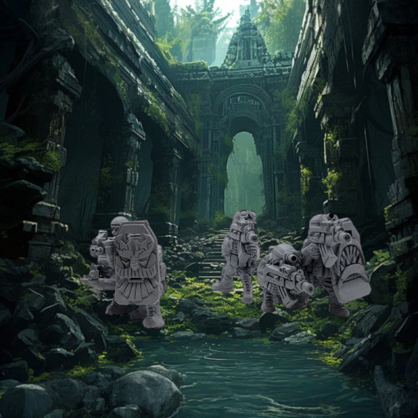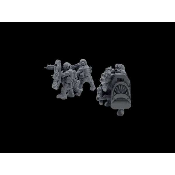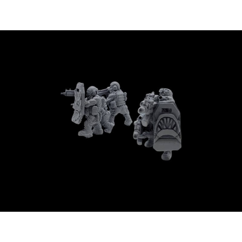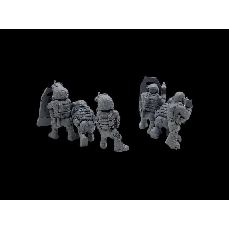 Ce set comprend deux team d'intervention avec des boucliers tactiques. Echelle : 28mm Moulage : en résine Sculpté par : Greg Girault