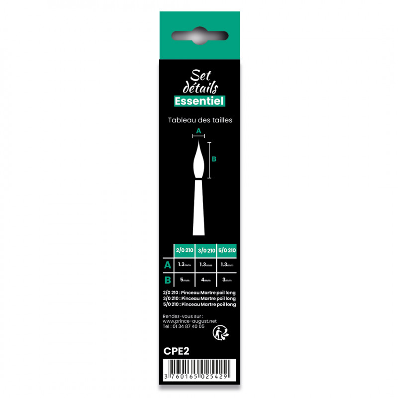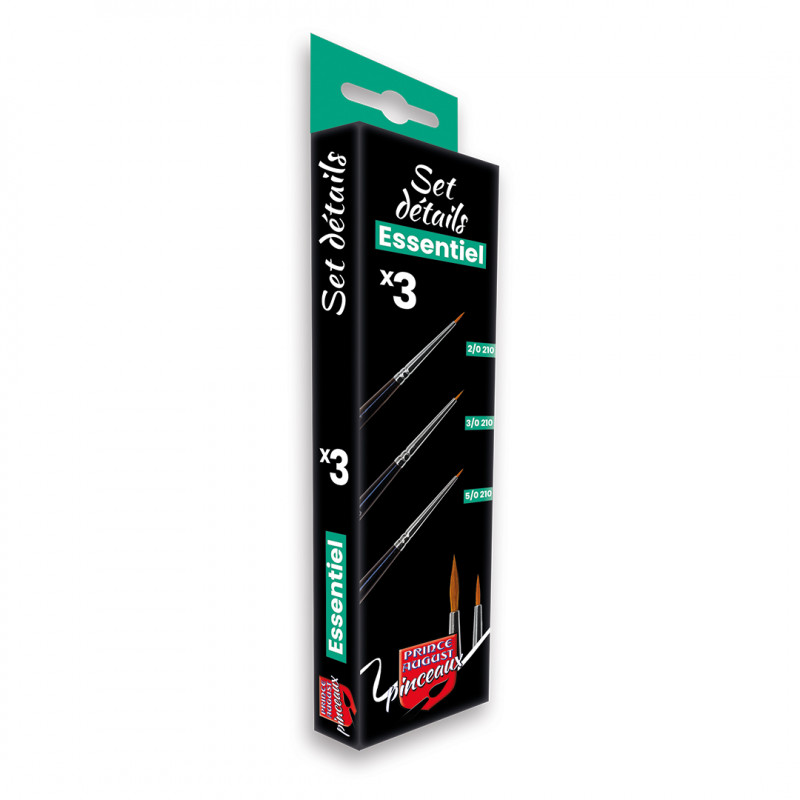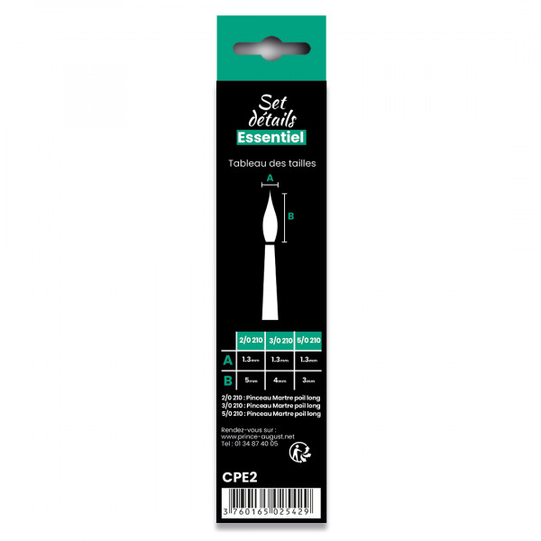 Le Set Détails CPE2, une sélection de pinceaux pour vos travaux les plus fins, pour une application précise et dans les moindres détails : 2/0 210 : Pinceau Martre Poil Long, 3/0 210 : Pinceau Martre Poil Long, 5/0 210 : Brosse plate Synthétique