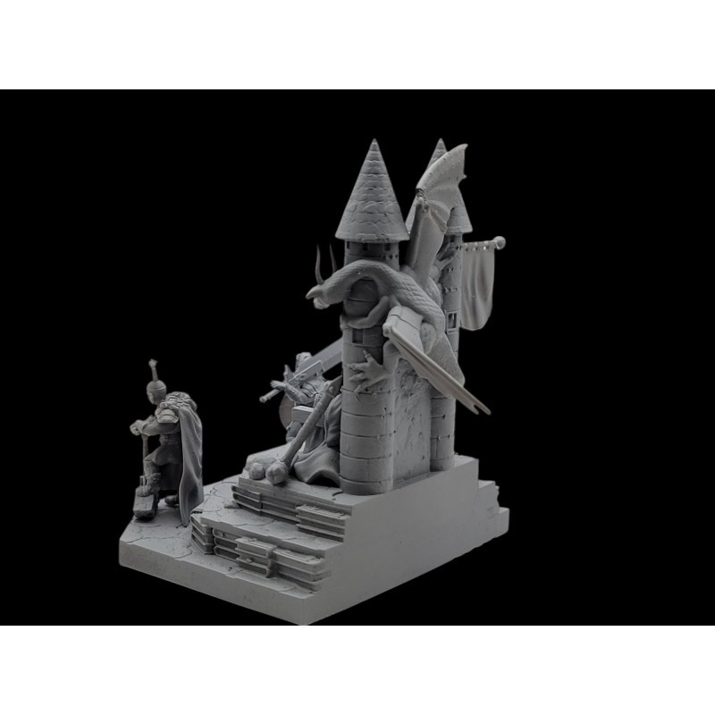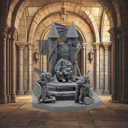 Ridge l'impétueux est assis sur son trône, buvant une bière, mais il est las, il est âgé, il a tout ce qu'il peut souhaité, la richesse, le pouvoir, la reconnaissance du peuple nain, ce qui lui manque c'est l'action, la guerre ... Décors composé d'un trône avec des deux tours et un dragon, le tout sculpté dans un rocher millénaire, des pièces de monnaies jonchent le sol et ses armes de guerre sont répartie autour de son trône, les marches permettent le stock les livres des rancunes. Deux gardes du corps veillent à sa sécurité. Premier prix sculpture 3D à Montrouge 2024. Echelle : 28mm. Moulage : en résine. Sculpté : par Greg Girault