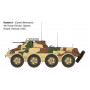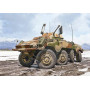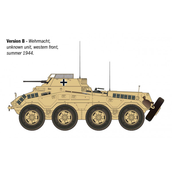 Les automitrailleuses allemandes Schwerer Panzerspähwagen Sd.Kfz. 234 furent produites durant la phase finale de la Seconde Guerre Mondiale. Elles se distinguaient par leur conception et fabrication soignées, alliant mobilité, flexibilité opérationnelle et capacité offensive. Elles représentaient un excellent compromis entre vitesse sur tout type de terrain, protection et puissance de feu, incarnant la synthèse de l’expérience opérationnelle acquise par la Wehrmacht au cours des premières années du conflit. Elles pouvaient atteindre une vitesse maximale de 85 km/h sur route. Parmi les différentes variantes produites, la Sd.Kfz. 234/1 avait fréquemment le rôle de véhicule de commandement. Également utilisée pour des missions de reconnaissance avancée, elle était équipé d’un canon de 20mm KwK 30 monté sur une tourelle ouverte, capable de fournir un appui-feu à l’infanterie et traiter des cibles faiblement blindées.