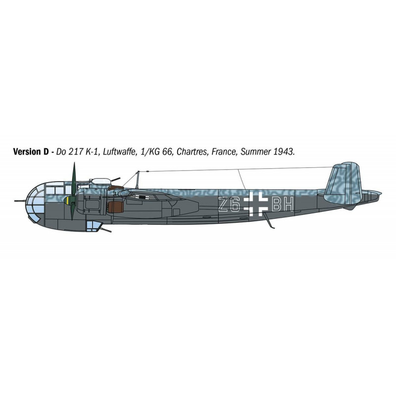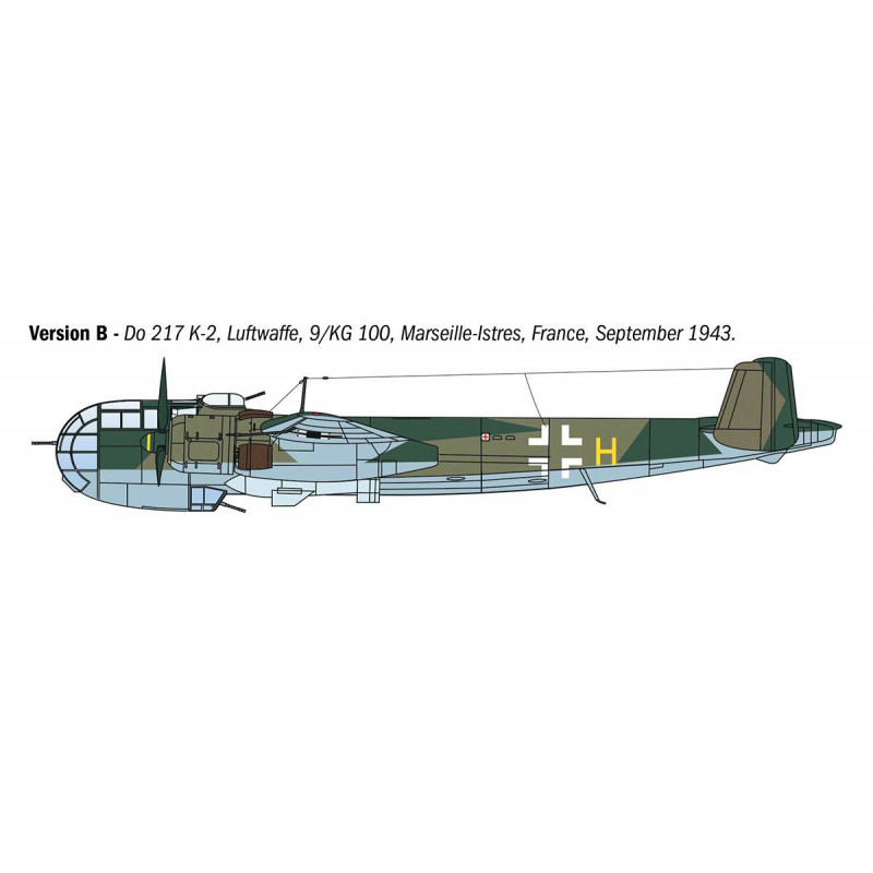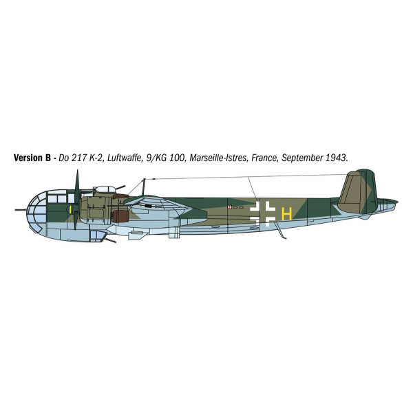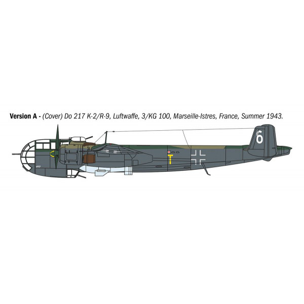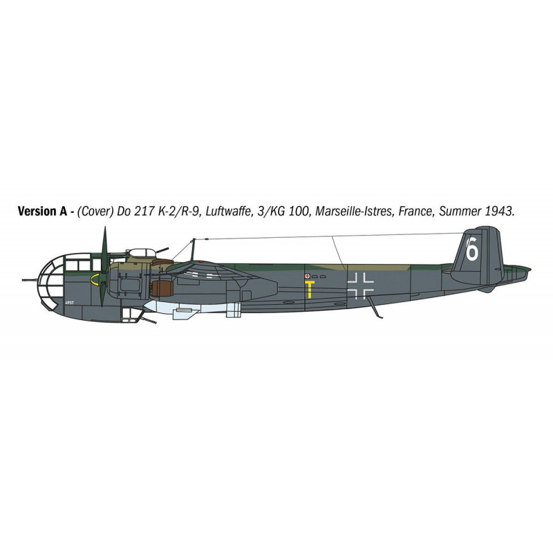 Le bombardier bimoteur à aile haute Dornier Do217 fut largement utilisé par la Luftwaffe durant la Seconde Guerre Mondiale. Décliné en différentes versions, il pouvait effectuer des missions de bombardement, d’attaque contre des cibles de surface ou de chasse de nuit. La version 217K se distinguait notamment par un fuselage renforcé, une voilure redessinée et des moteurs plus puissants. Il était destiné à transporter et utiliser la bombe radioguidée Ruhrstahl SD 1400 “Fritz X”, véritable innovation technologique pour l’époque, montée sous les ailes. Dans cette configuration, le Do217K fut principalement engagé sur le théâtre d’opérations méditerranéen. Le 9 septembre 1943, le cuirassé italien Roma fut touché et coulé par une Fritz X au large de la Sardaigne.