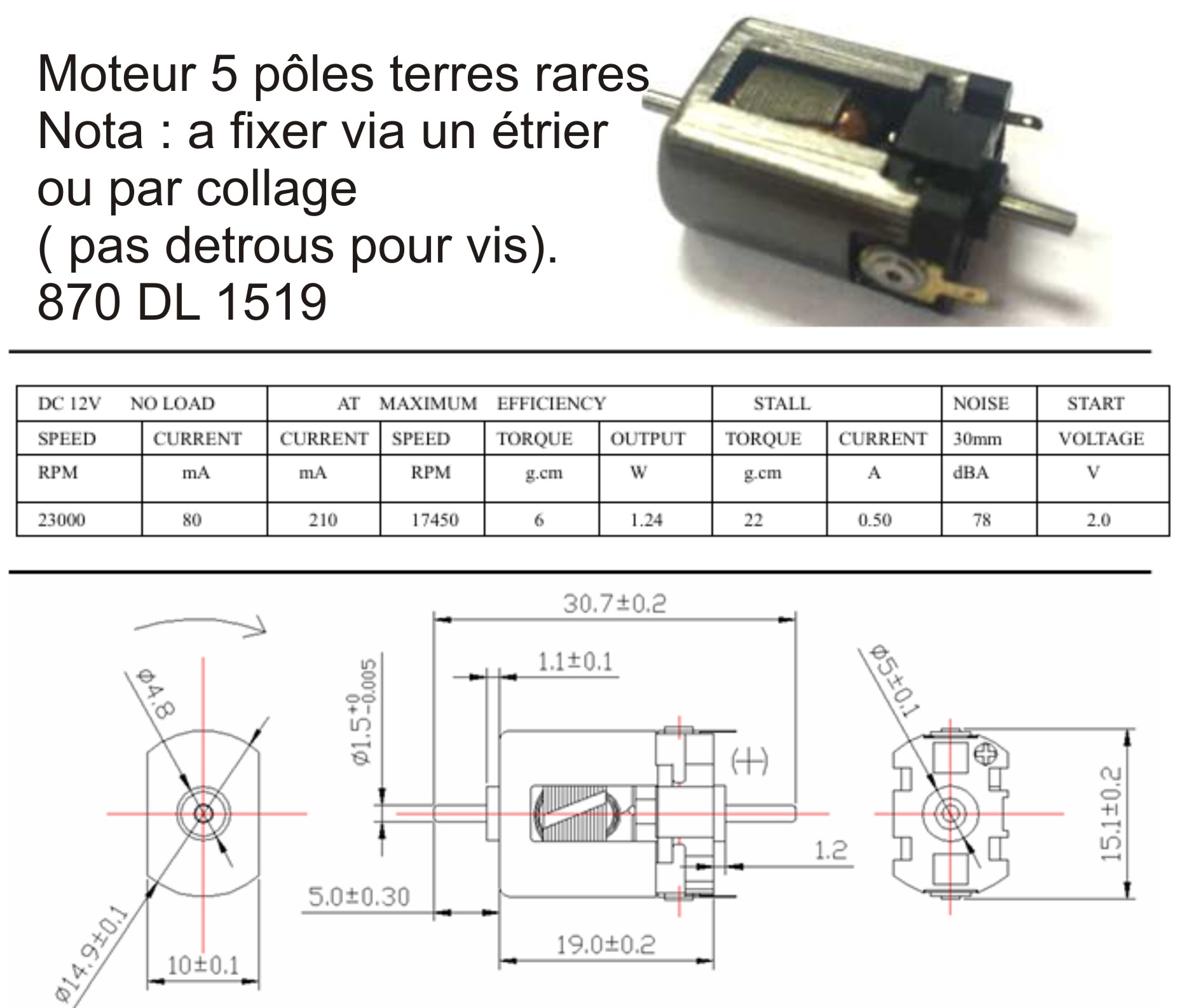 Moteur DL1519 avec aimant terres rares 870 DL 1519 axes de 1,5mm dimensions 15x19mm.