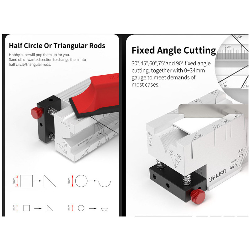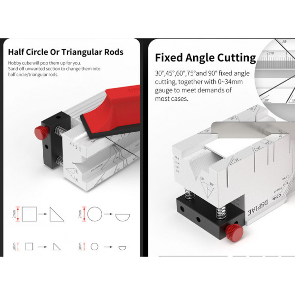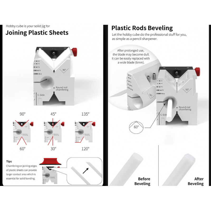 Cette outil vous servira à énormément de chose : percer vos tubes ou barres plastique avec précision, sert de gabarit de coupe, vous assiste pour coller des pièces (tel que des plaques) avec différents degrés, chanfreiner, créer des triangles et demi-cercle à partir de barres et bien plus encore (voir photos)