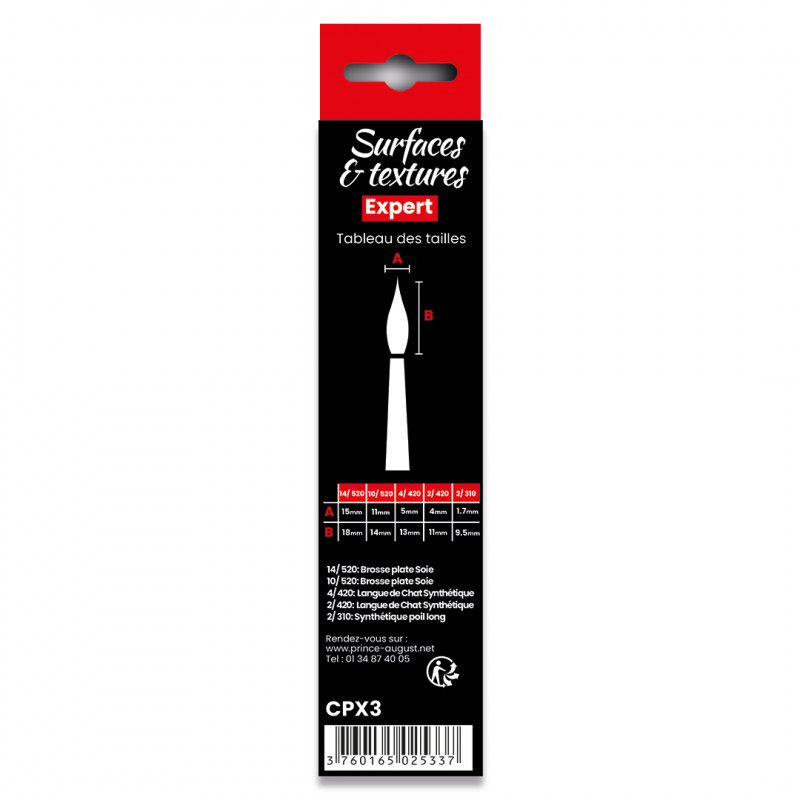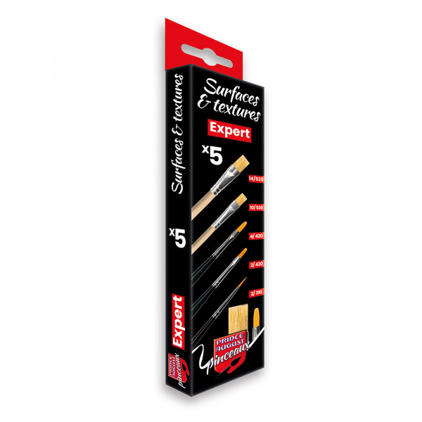Le set Surfaces & Textures CPX3, une sélection de 5 pinceaux techniques pour couvrir tous les stades de réalisations de vos supports : 2/0 310 : Synthétique Poil Long, 3/0 310 : Synthétique Poil Long, 5/0 310 : Synthétique Poil Long, 3/0 100 : Martre Kolinsky Poil Court, 5/0 100 : Martre Kolinsky Poil Court